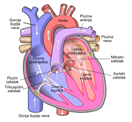 Ljudsko srce ima četiri šupljine: dvije pretklijetke i dvije klijetke. U medicini se često rabi izraz "desno" i "lijevo" srce. Desno srce čini desna pretklijetka i desna klijetka; u desnu pretklijetku dolazi venska krv iz tijela koja se kroz desnu klijetku pumpa u pluća. Rad srca čine dvije radnje - skupljanje i širenje. Otkucaje srca moguće je osjetiti na vratu, zapešću ili podlaktici. To je bilo ili puls. Krv iz desnoga srca u pluća vodi plućna arterija (u njoj se nalazi venska krv, no zove se arterija zato što je pravilo da se sve krvne žile koje idu od srca prema periferiji nazivaju "arterijama"). U plućima se krv rješava ugljikovog dioksida, a obogaćuje kisikom. Takva pročišćena krv sada je arterijska te iz pluća dolazi u lijevu pretklijetku plućnim venama (iako sadrže arterijsku krv, zovu se vene jer dolaze s periferije u srce). Iz lijeve pretklijetke arterijska krv dalje odlazi u lijevu klijetku pa u aortu, koja je raznosi po cijelome tijelu. Budući da lijevo srce pumpa arterijsku krv u cijelo tijelo (a desno srce vensku krv samo u pluća), u lijevom su srcu tlakovi triput veći te su njegove stijenke deblje i jače. Latinski naziv za pretklijetku jest atrium (atrij), a za klijetku ventriculus (ventrikul). "Zid" koji dijeli srce na desno i lijevo srce (srčana pregrada) naziva se septum cordis. Zbog septuma nema kontakta između dviju pretklijetki i dviju klijetki. U protivnome bi došlo do miješanja venske i arterijske krvi.Između pretklijetke i klijetke nalazi se suženje (ventil ili valvula) sa zaliscima (zalistak je na latinski cuspis). Zalisci sprječavaju vraćanje krvi iz klijetke u pretklijetku. U desnom srcu nalaze se tri takva zaliska pa se valvula naziva "trikuspidalna valvula" ili valvula s tri kuspisa. U lijevom srcu između pretklijetke i klijetke nalaze se dva zaliska pa je to bikuspidalna valvula (još se zove i mitralna, jer sliči biskupovoj mitri). Zalisci se također nalaze na izlazu iz klijetki u plućnu arteriju i aortu. Ti zalisci se nazivaju polumjesečasti zalisci (lat. valvulae semilunares) i na polazištu arterije nalaze se po tri polumjesečasta zaliska. Na slobodnim rubovima zalistaka vežu se tanke tetivaste strune (lat. chordae tendineae), koje te rubove spajaju s bradavičnim mišićima (lat. musculi papillares). Ti mišići strše iz zidova srčane klijetke i vrhom su usmjereni prema pretklijetkama. Zalisci na izlasku iz desnog i lijevog ventrikula, smješteni su u početku plućne arterije i u početku aorte. Polumjesečasti zalisci lijeve i desne komore jednake su i oblikuju ih po tri tanka vezivna listića obložena endokardom. Srčani mišić krvlju opskrbljuju vjenačne arterije (lat. aa. coronariae cordis). Potoje dvije arterije i izlaze iz samog početka aorte, a ulaze u srčani mišić ispod zalistaka. Ako se zbog bilo kojeg razloga krv vraća nazad kroz valvulu u pretklijetku, to se naziva insuficijencija valvule. Riječ insuficijencija dolazi od latinske riječi za "nedovoljno". Dakle valvula je nedovoljno funkcionalna da bi spriječila vraćanje krvi natrag. Ako zbog poremećaja srce treba obaviti veći rad nego što je normalno, srčane stijenke se zadebljavaju. Dvije faze rada srca jesu sistola i dijastola. Sistola je ispumpavanje, a dijastola punjenje srca krvlju.